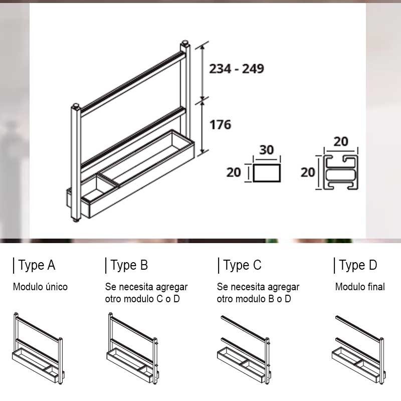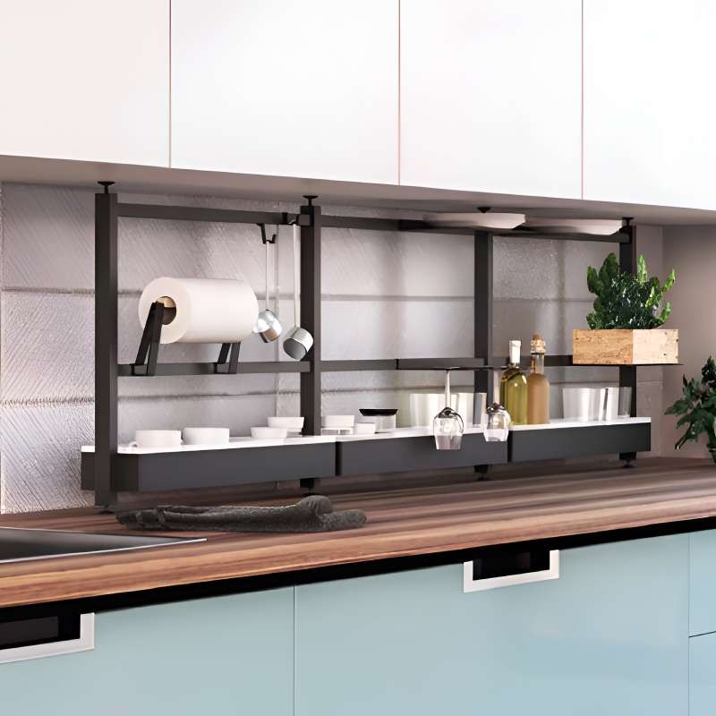 Linero Grid é um sistema modular de organização para cozinhas, desenvolvido pela Cucine Oggi. A sua estrutura em alumínio lacado permite otimizar o espaço entre a bancada e os armários superiores, sem necessidade de perfurações.