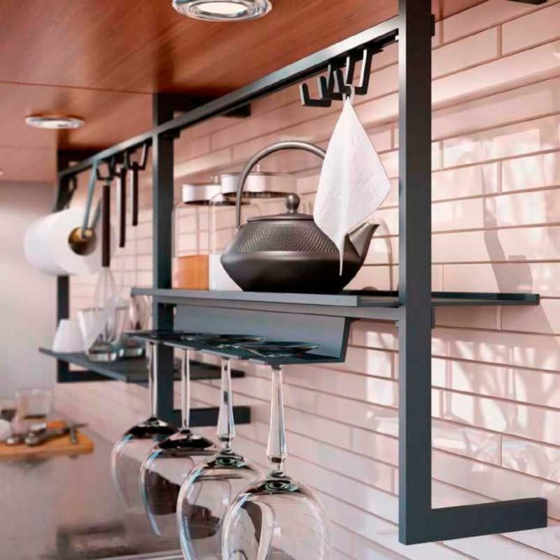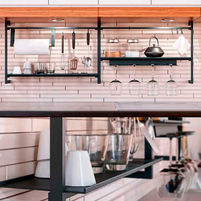 O sistema Up é fixado na parte inferior dos armários superiores, permitindo otimizar o espaço sem necessidade de parafusos na parede traseira da cozinha. A estrutura modular é composta por 2 barras horizontais móveis que podem ser personalizadas com uma ampla gama de acessórios de cozinha. Funcional e elegante, adiciona ordem e minimalismo à sua cozinha.