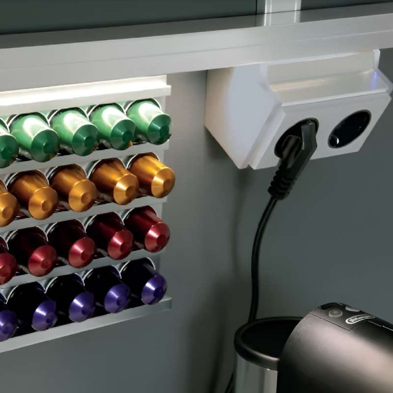 O Energy Box é um módulo funcional projetado para integrar-se ao sistema Linero Modern. Este acessório incorpora duas tomadas protegidas por tampas, permitindo conectar eletrodomésticos de uso frequente diretamente na área de trabalho da cozinha.