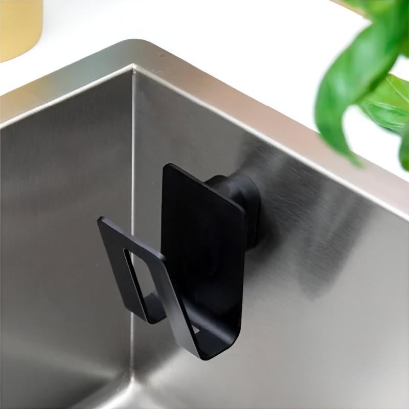 Acessório para pia em biocompósito preto para colocar a esponja de cozinha. Fixação à pia através de base adesiva e um ímã.