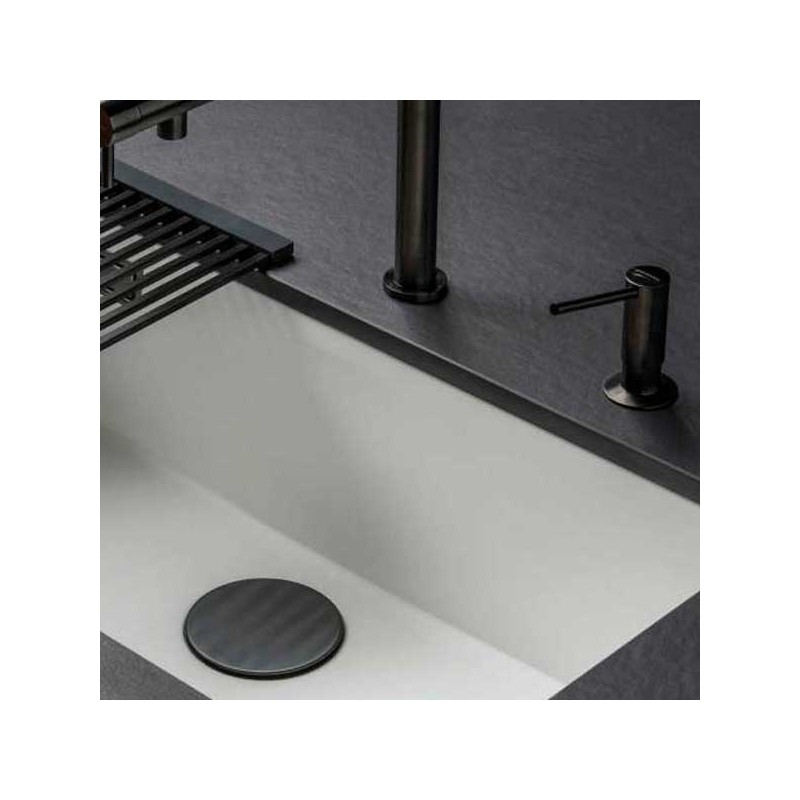 Dispensador de sabão modelo redondo para pia de cozinha. Acabamento: preto, cromado ou inox a escolher. Carga superior. Capacidade da garrafa: 500 ml.