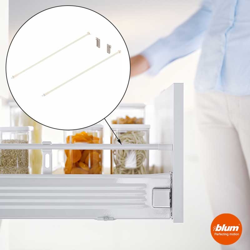 Barras laterais longitudinais redondas com adaptador para a traseira de gaveta Blum Metabox altura M 86 mm e 50 cm de profundidade. Conteúdo: 2 pçs.