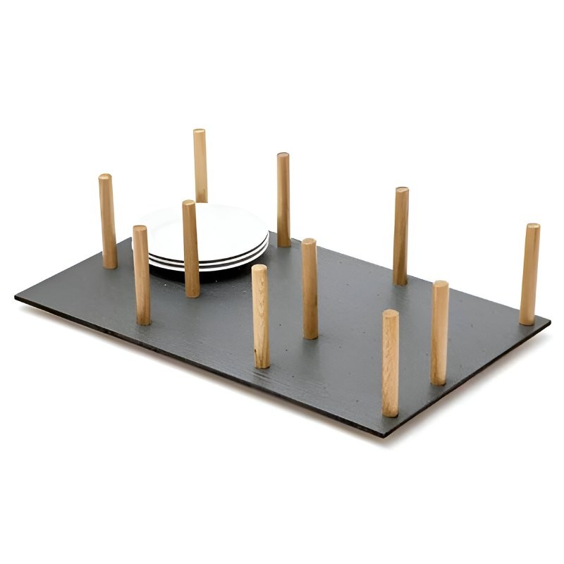 Interior Gaveteiros Mix Set 3 da Cucine Oggi: conjunto organizador com fundo perfurado em antracite e pinos de carvalho maciço para manter pratos e utensílios ordenados em gaveteiros de 900 mm.