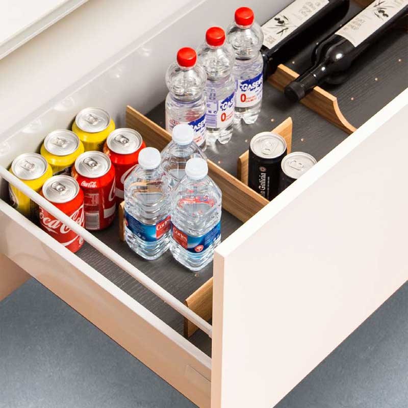 Interior Gaveteiros Mix Set 5 da Cucine Oggi: organizador para gaveteiros de 900 mm em carvalho e antracite com divisões e garrafeira.