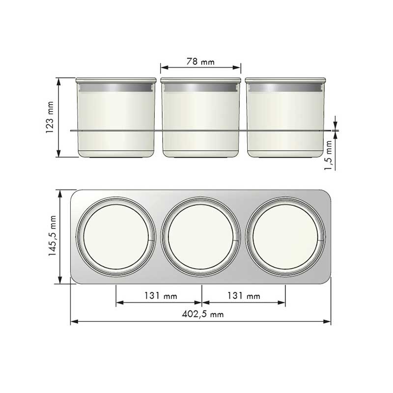 Conjunto de 3 potes de vidro de 1 l cada um, com fecho hermético e suporte de aço cor prata ou antracite compatível com bandeja cubertero multiuso Classic de Menage & Confort. Medida (largura x altura x profundidade): 145,5 x 123 x 402,5 mm.
