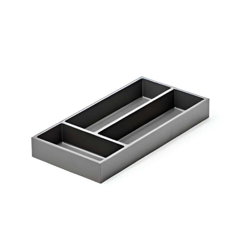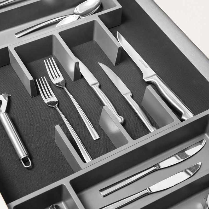 O sistema Connect é uma solução modular altamente flexível concebida para se adaptar a qualquer gaveta de cozinha. Os seus elementos de poliestireno na cor antracite conectam‑se entre si através de um sistema estável e componível, permitindo criar configurações totalmente personalizadas. O sistema não depende das laterais da gaveta, garantindo compatibilidade com qualquer largura ou profundidade. Este set Connect 5 foi pensado para gavetas de 700 a 1200 mm, oferecendo uma organização moderna, ajustável e compatível com todos os sistemas de corrediças do mercado.