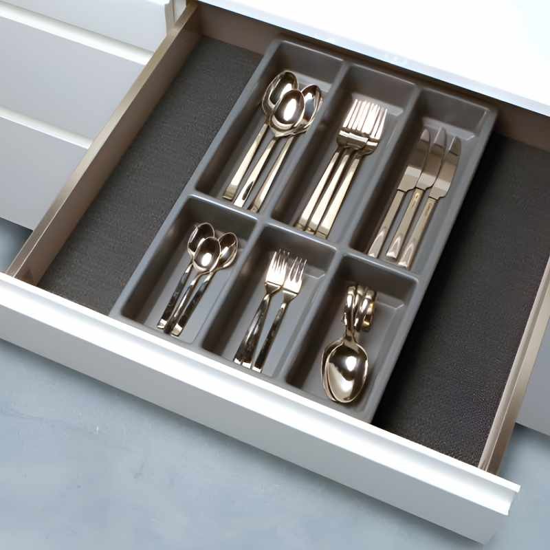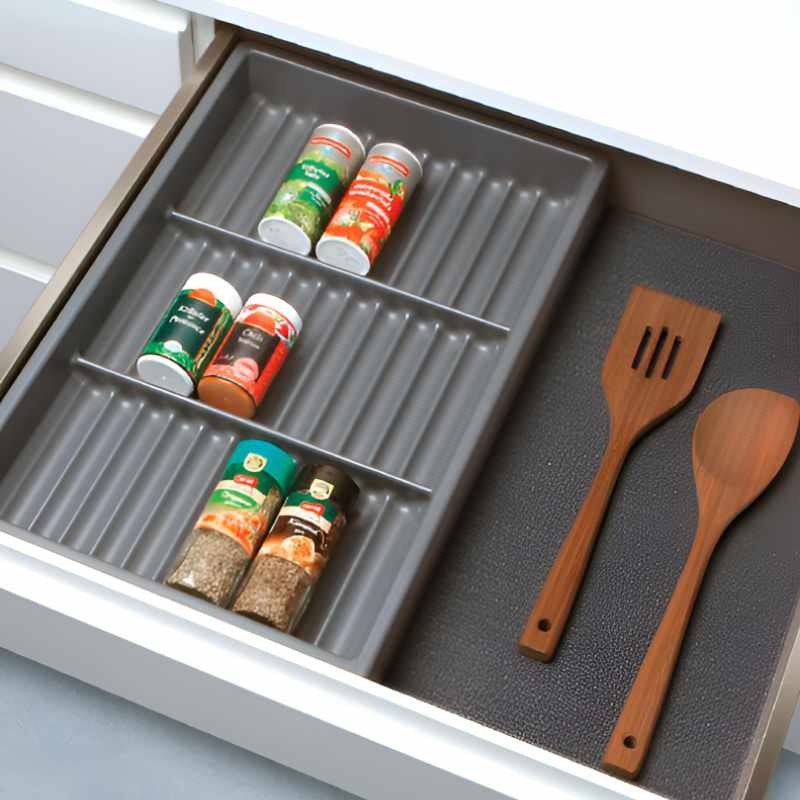 Acessório opcional: Adicione o tapete rígido antiderrapante em cor preta (não incluído) para proporcionar um acabamento elegante à sua gaveta de cozinha.