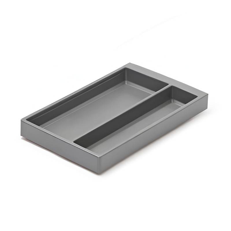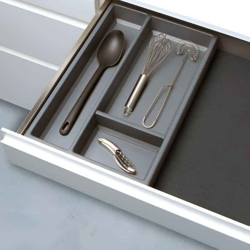 A família Island da Cucine Oggi demonstra como três peças independentes —organizador de talheres, porta‑especiarias e porta‑utensílios— podem transformar a organização interior da gaveta com uma estética elegante e um preço super económico. Fabricadas em polipropileno cinzento antracite e com laterais fechados, cada peça tem 300 mm de largura e pode ser adquirida separadamente conforme as necessidades do cliente. Como acessório adicional, oferece‑se um tapete rígido antiderrapante em cor preta (não incluído), que proporciona um acabamento mais uniforme e sofisticado.