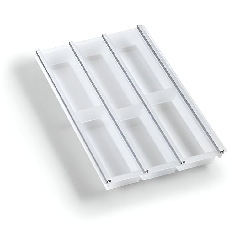 Apresentamos os equipamentos de gaveta do Fusion System. Estes organizadores foram concebidos para preencher totalmente a largura da gaveta utilizando cubetas de plástico, sem necessidade de tapetes antiderrapantes. O Set 2 foi pensado para gavetas de 400 mm e oferece uma organização moderna, prática e totalmente integrada graças à combinação de cubetas modulares, varilhas e terminais flexíveis. Disponível em vários acabamentos transparentes, proporciona uma estética atual e uma funcionalidade excelente.