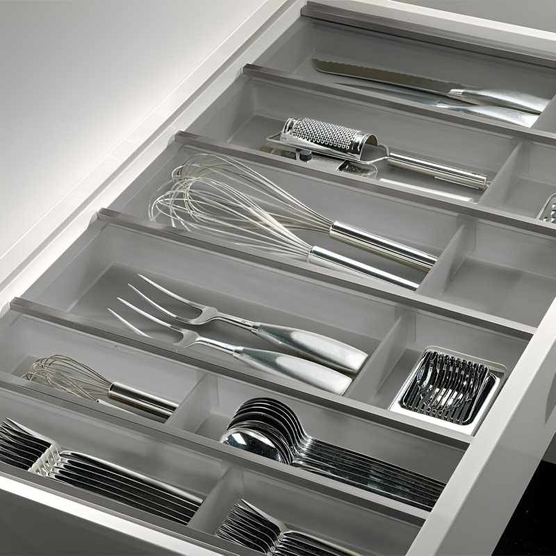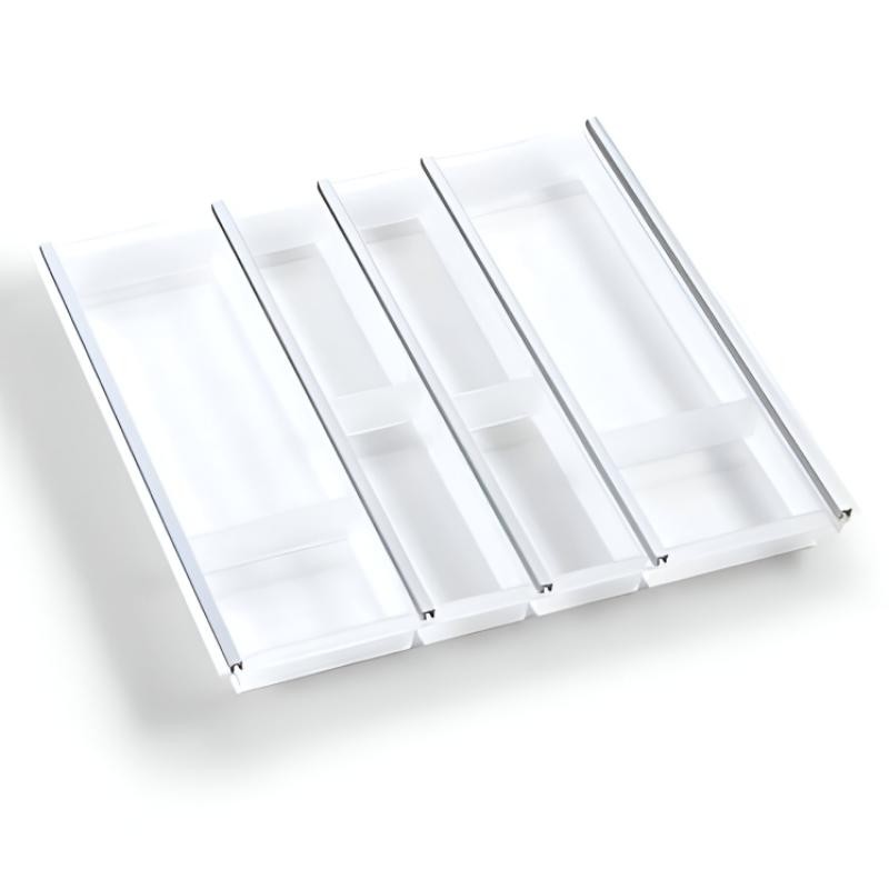 Organizador de Talheres Fusion System Set 5 para gavetas de 600 mm, com cubetas modulares, varilhas e terminais que oferecem uma organização moderna