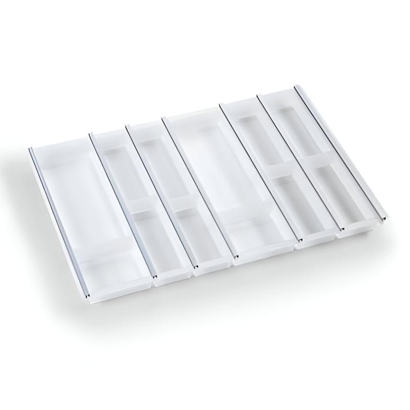 Organizador de Talheres Fusion System Set 8 para gavetas de 800 mm, com cubetas modulares, varilhas e terminais que oferecem uma organização moderna e totalmente integrada.
