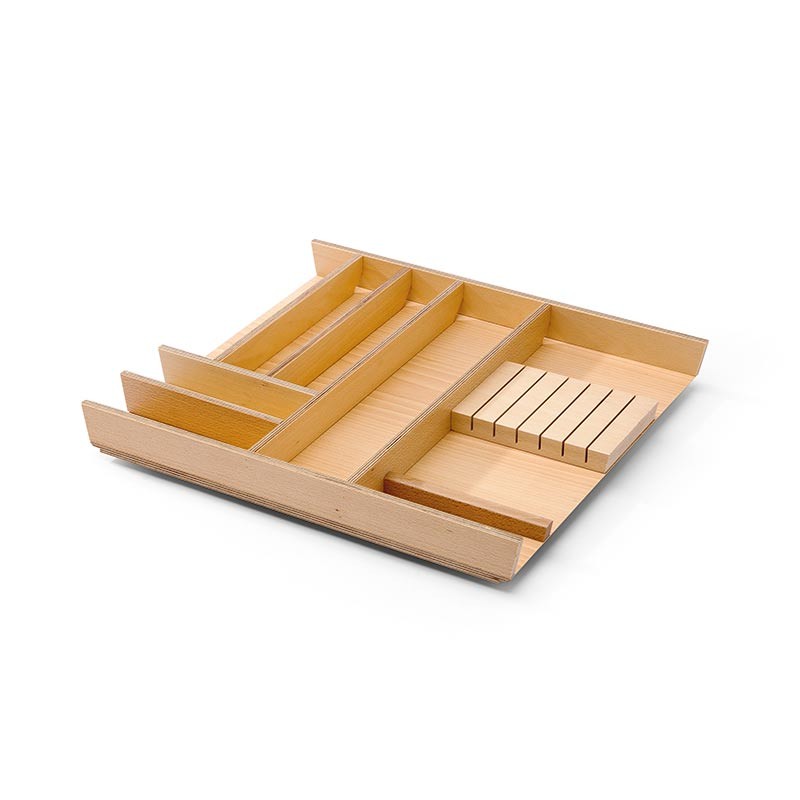 Organizador de Talheres em painel marinho fenólico folheado a faia, com design sem lateral, inclui cuteleiro e 6 compartimentos, ideal para organizar as suas gavetas de cozinha de 500 mm.