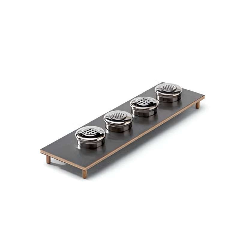 Acessório porta‑especiarias com 4 frascos em aço inox incluídos, para instalar no espaço A dos cuberteros marinhos de 600, 900 e 1200 mm.