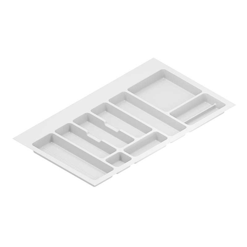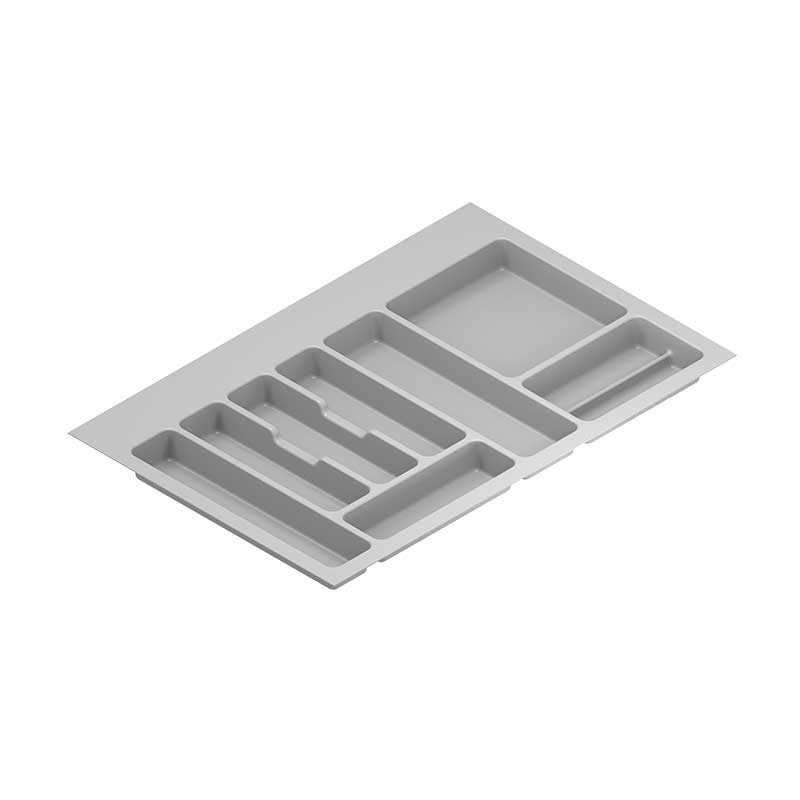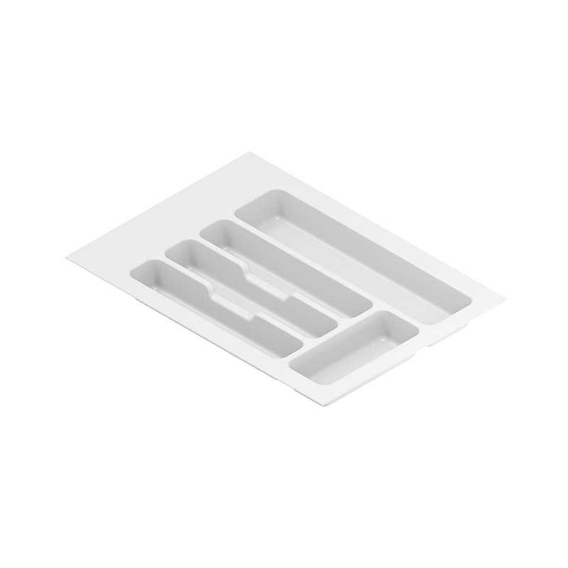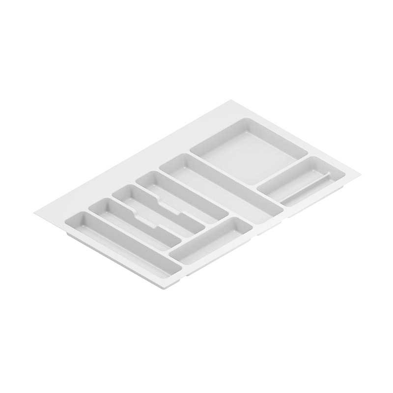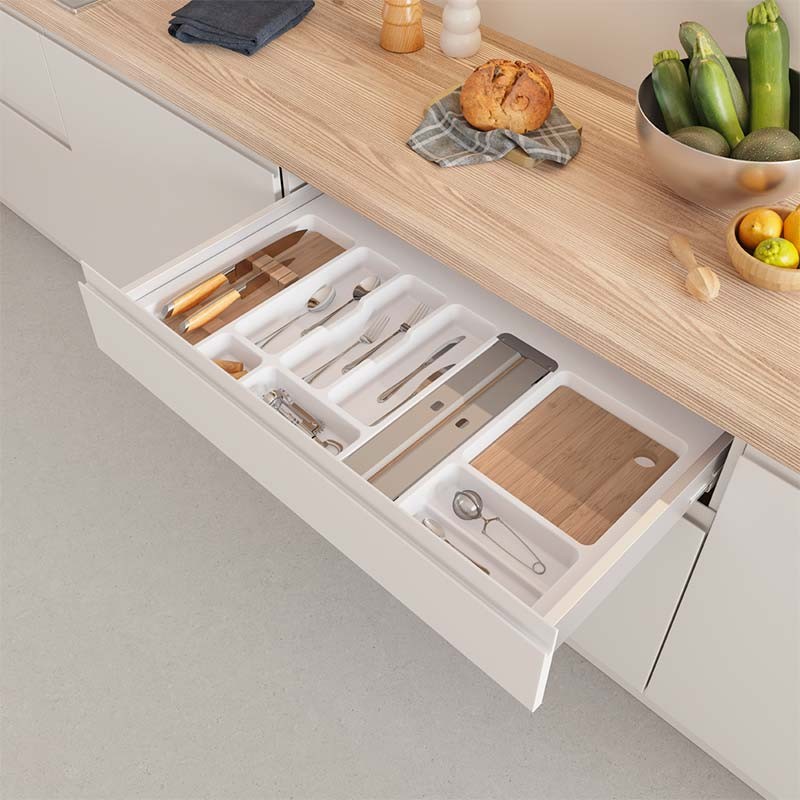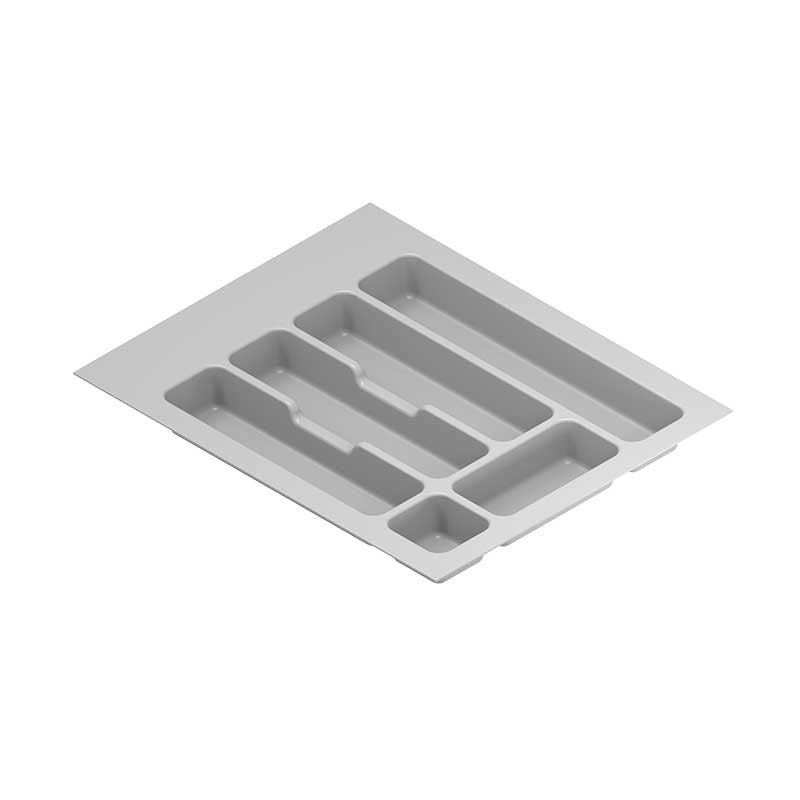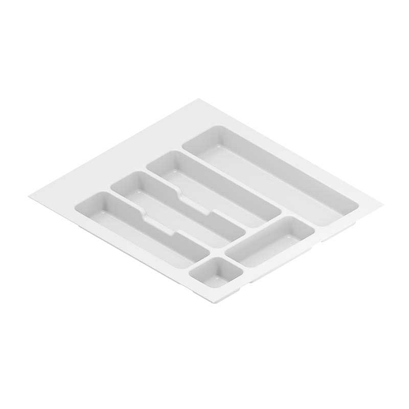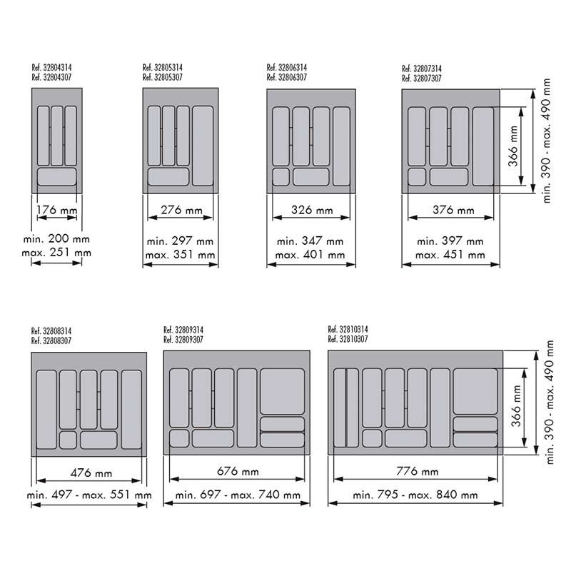 O porta-talheres está disponível em diferentes medidas de largura para que possamos escolher dependendo da largura de nosso gaveta, mas também permite adaptá-lo facilmente através de corte na largura dentro das medidas que especificamos mais tarde. O fundo também é recortáveis para adaptar a gavetas que tenham um fundo interno entre 390 e 490 mm.