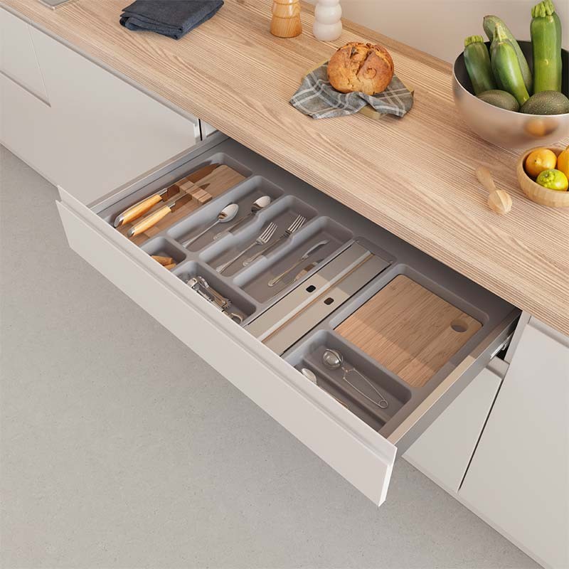 Porta-talheres modular para gaveta de cozinha fabricado em polipropileno cor cinza, branco ou antracite a escolher. Adaptável a qualquer gaveta.