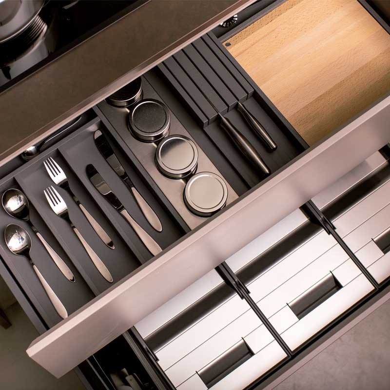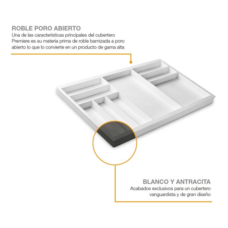 Porta talheres de madeira modelo Premiere para gavetas de cozinha. Disponível na cor branco ou antracite, e para diferentes medidas de móveis.