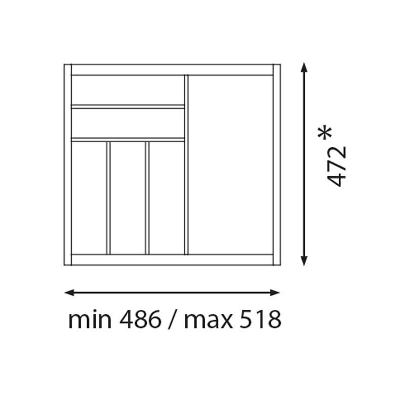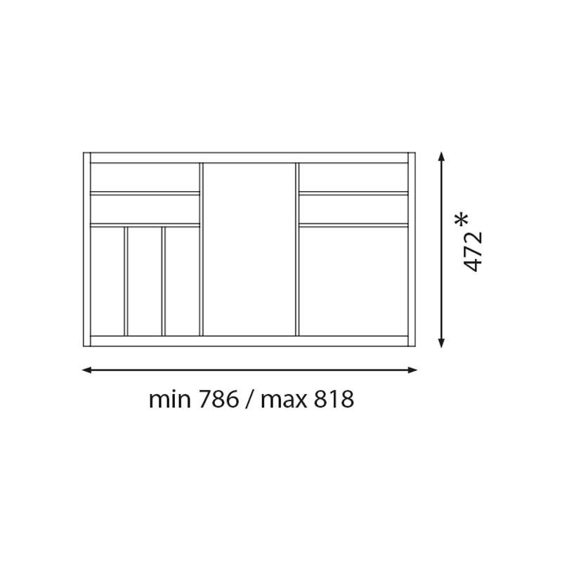 As dimensões totais do porta-talheres (largura x profundidade x altura) de acordo com a largura dos móveis com os quais é compatível são as seguintes: