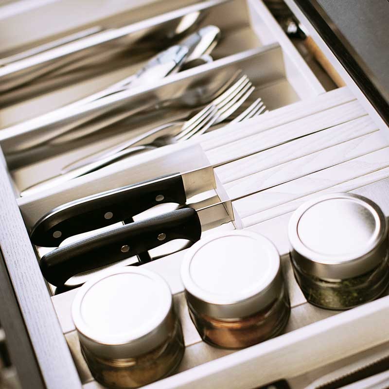 Suporte de facas de madeira para porta talheres de cozinha modelo Premiere. Disponível na cor branca ou antracite. Dimensões: 110 x 423 x 38 mm.