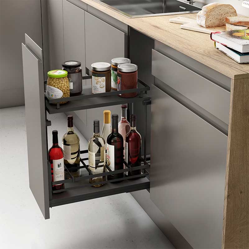 Módulo extraível garrafeiro para móveis de cozinha. Ideal para o armazenamento de garrafas, frascos e artigos semelhantes. O kit inclui elementos separadores para evitar que as garrafas batam umas com as outras.