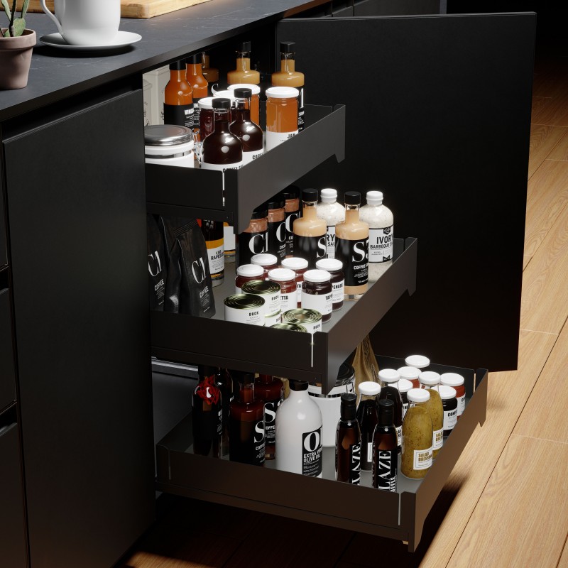 Cesto extraível Nova Flat para móvel de cozinha em aço com acabamento antracite com base antiderrapante e guias ocultas de extração total e fechamento amortecido.
