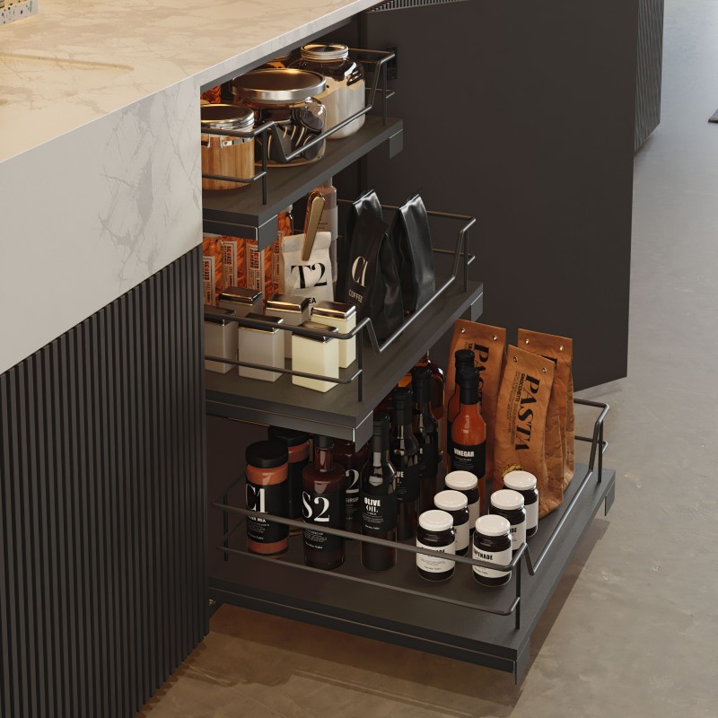 Cesto extraível multiuso linha Compact da Menage Confort em aço cor antracite para armazenamento organizado e acessível em móveis de cozinha.