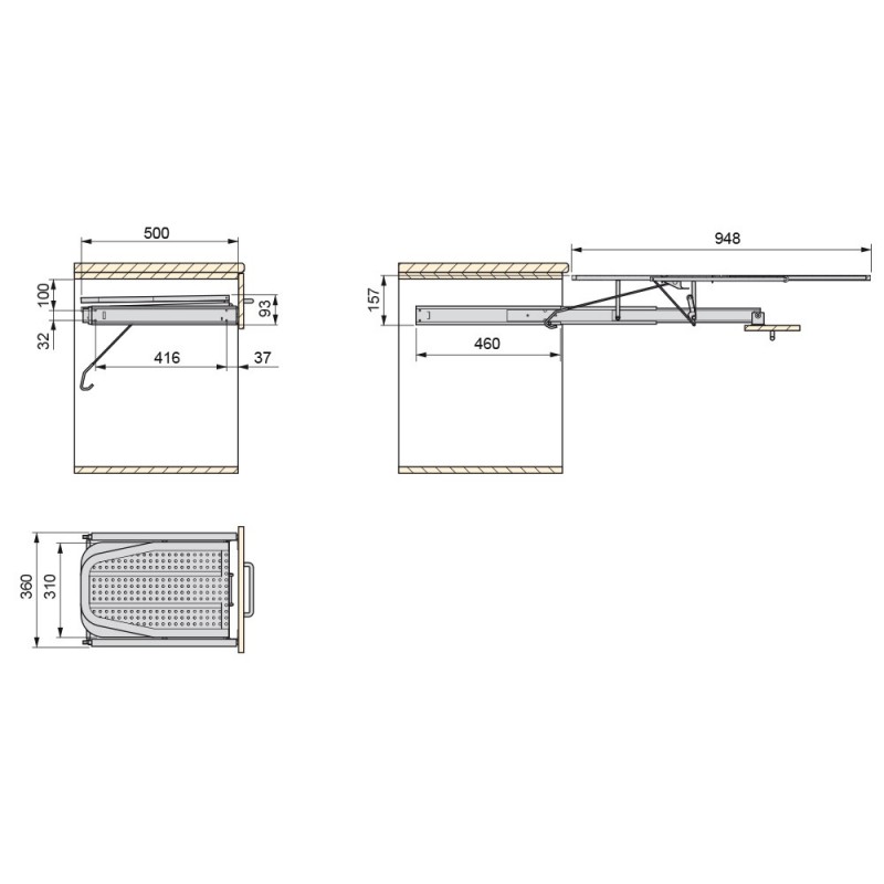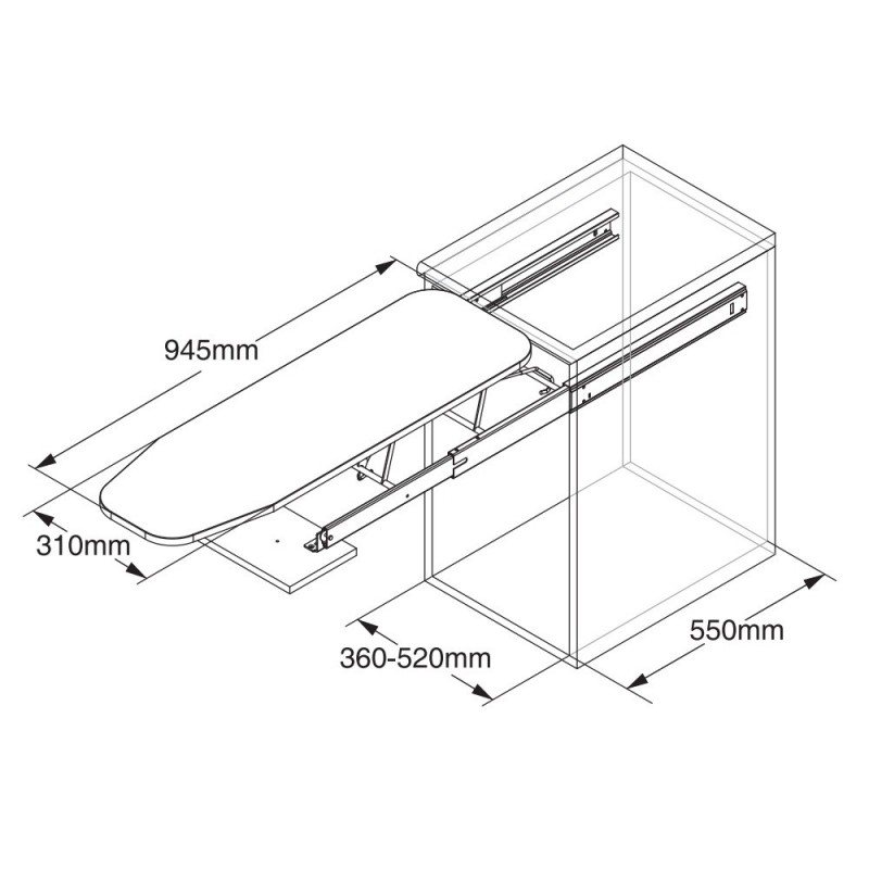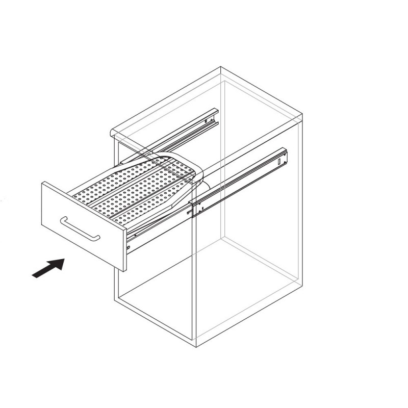 Ferro de engomar Iron fabricada em aço com acabamento pintado branco. As guias que incorpora a sua estrutura permitem que fique perfeitamente integrada no armário quando está dobrado. Para sua instalação é necessário um armário com uma profundidade mínima de 500 mm e uma largura interna de módulo de entre 360mm e 520mm.