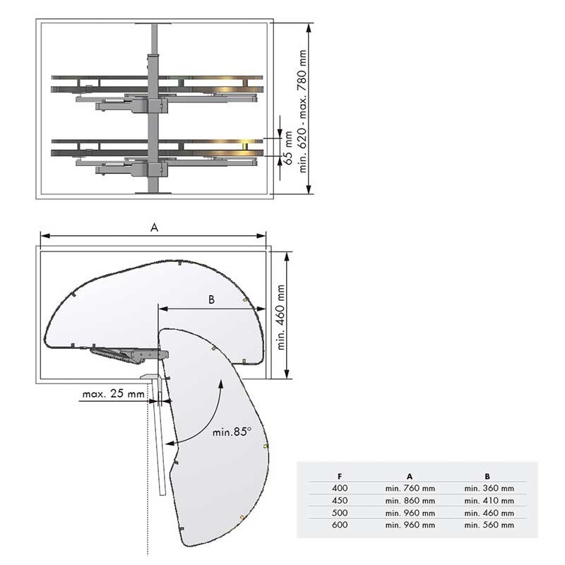 Módulo destacável para armário de canto de cozinha. Dupla altura de bandejas para um melhor aproveitamento do espaço. Cada caixa sai independentemente.