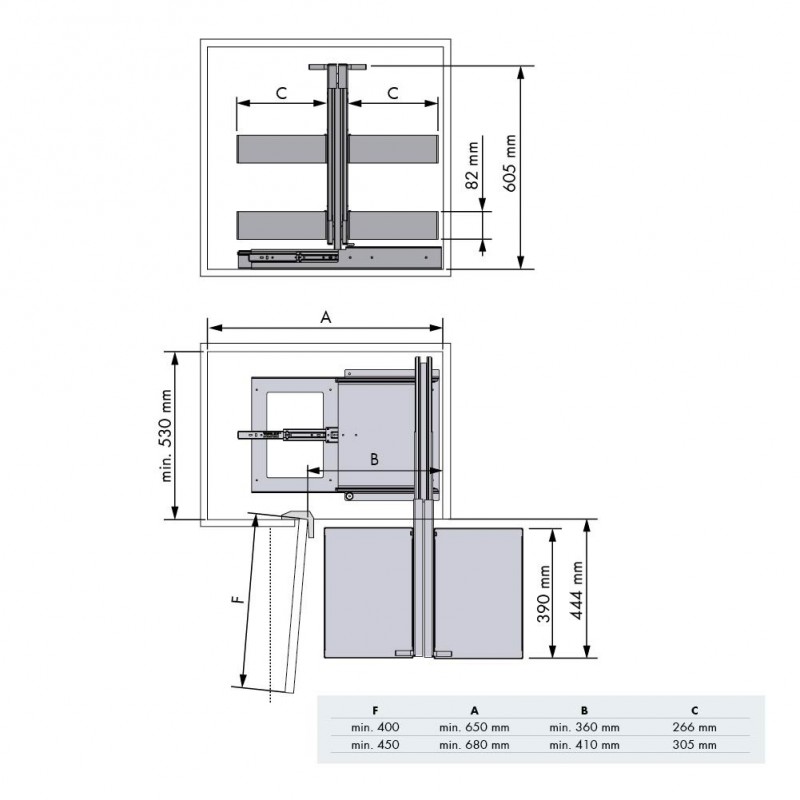 A seguir detalham-se as dimensões dos modelos disponíveis dependendo da largura do móvel ao qual se destinam. Todas as medidas estão expressas em milímetros.