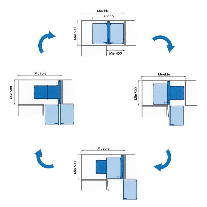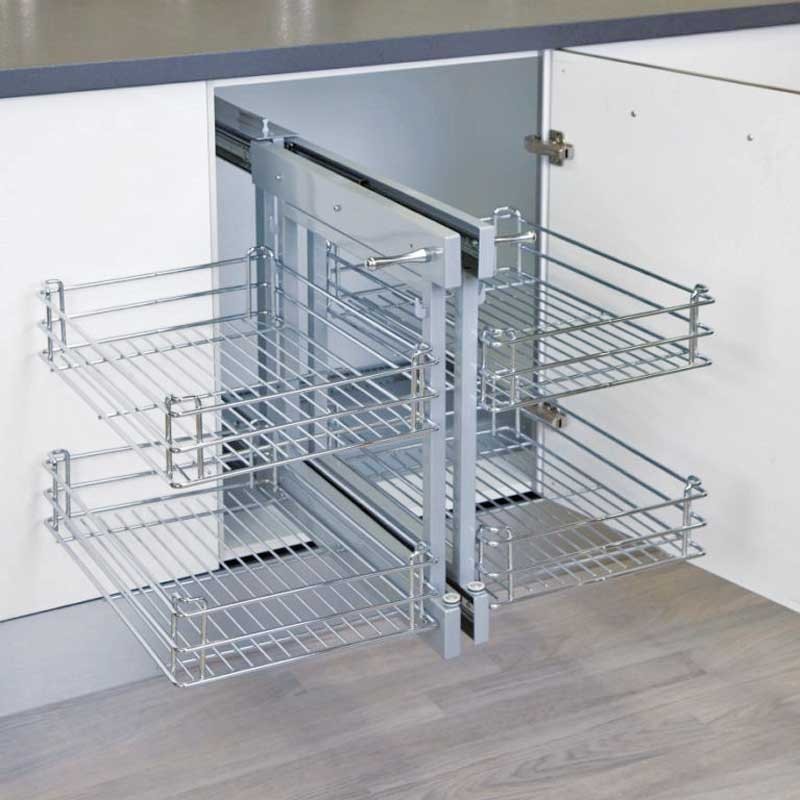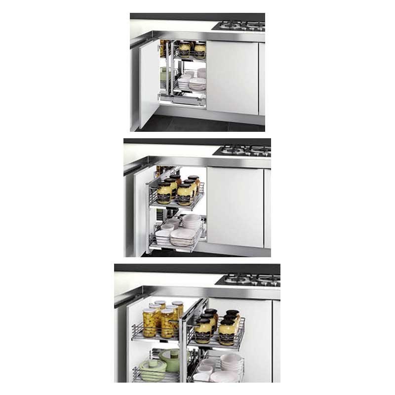 Módulo destacável de 4 bandejas Magic Corner para armário de canto cego de cozinha de 800 mm de largura mínima e a porta de 450 mm. Bandejas com base de madeira ou aresta a escolher.