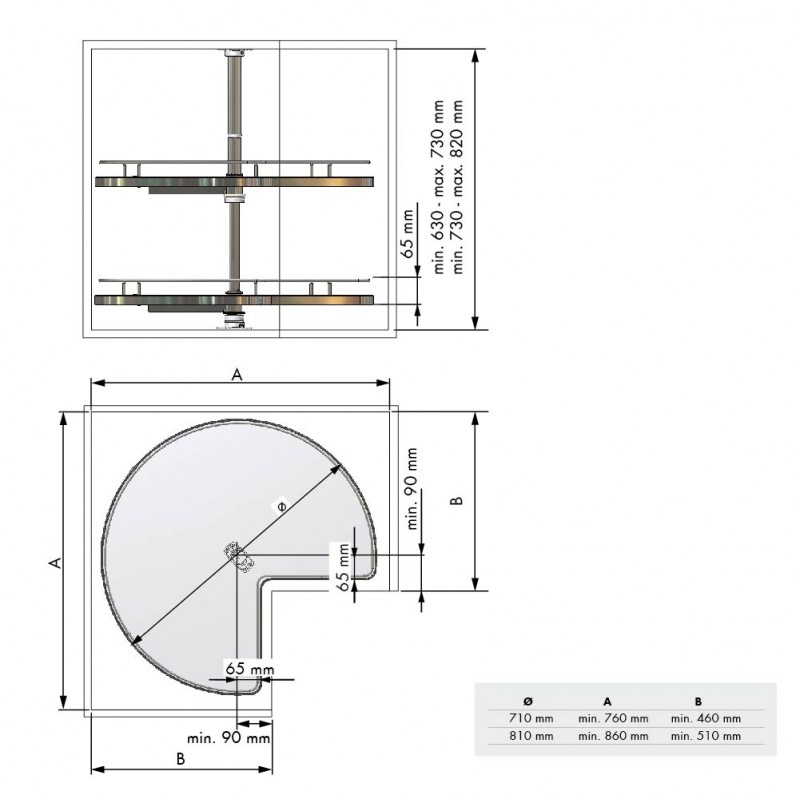 Diâmetro bandejas: 71 cm no armário de 80x80 cm e de 81 cm no armário 90x90 cm