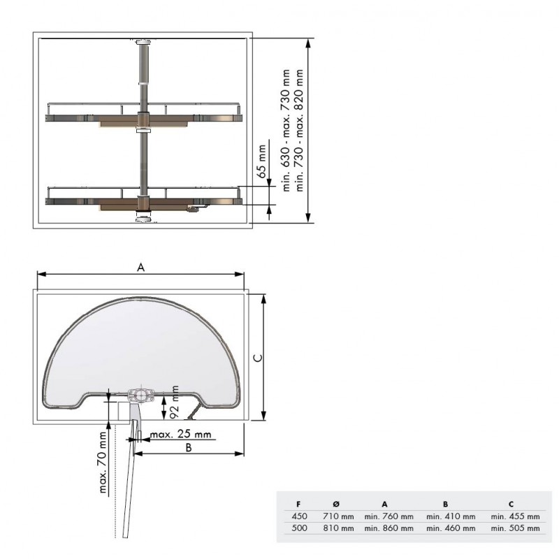 Eixo ajustável em altura de 630 mm a 730 mm ou de 730 mm a 820 mm para escolher