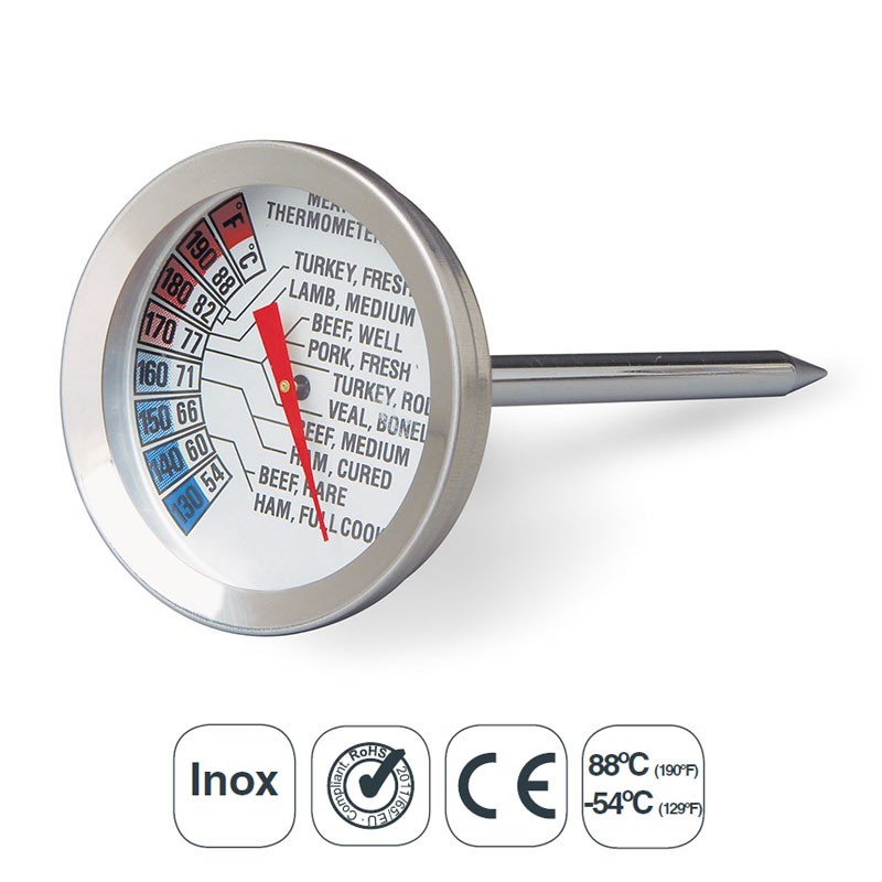 Termômetro para controlar a temperatura interna da carne com um intervalo de-54ºC até 88ºC. Inclui escala em graus Fahrenheit. Medição sonda: 11 cm