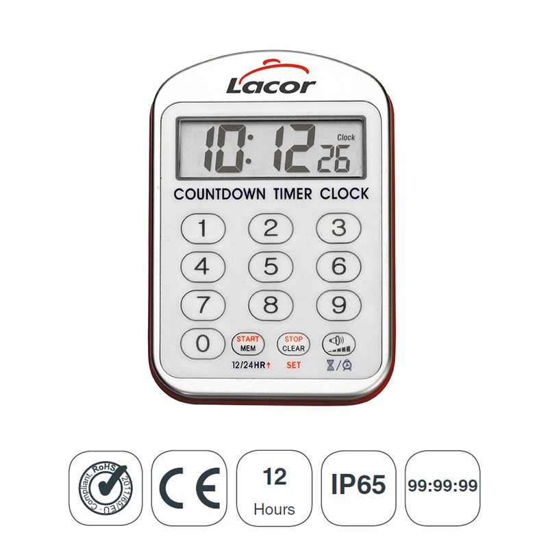 Relógio de cozinha digital com alarme para controlar o tempo de cozinhado. Programação de até 12 horas. Base magnética para fixação em superfícies metálicas. Medidas: 13x24,5x2,5 cm