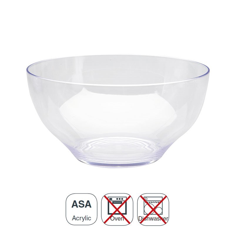 Tigela redonda de 25 cm de diâmetro e 4 litros de capacidade fabricada em plástico acrílico transparente.