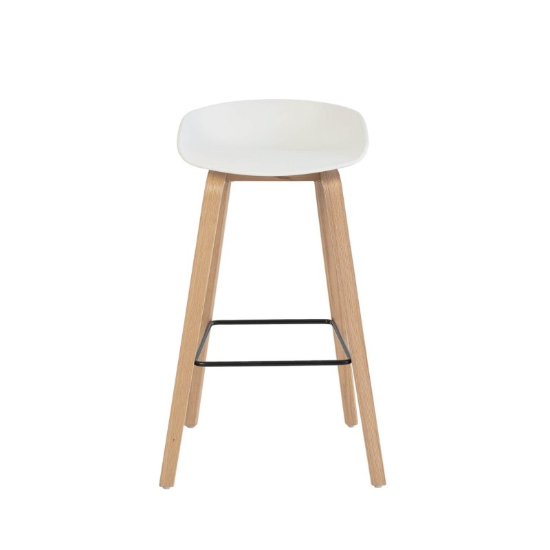 O taburete alto RONIE se destaca por sua estrutura elegante com pernas de madeira e assento de polipropileno branco, projetado ergonomicamente para oferecer o máximo conforto.