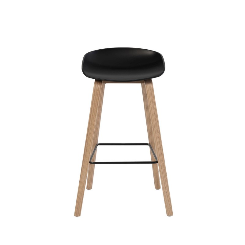 A banqueta alta RONIE destaca-se por sua elegante estrutura de pernas de madeira e seu assento de polipropileno preto, projetado ergonomicamente para oferecer o máximo conforto.
