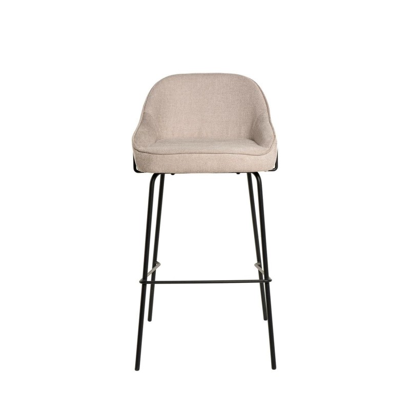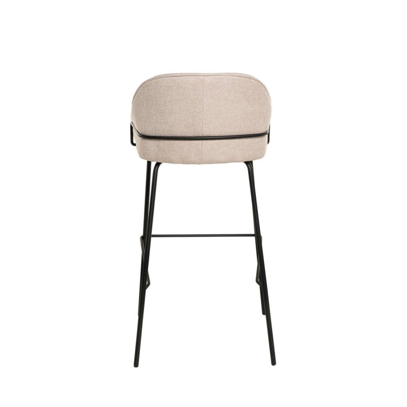 Banco alto LOUIS bege, ideal para cozinhas ou bares. Assento estofado em tecido bege, estrutura de metal moderna e resistente. Encosto integrado para maior conforto.
