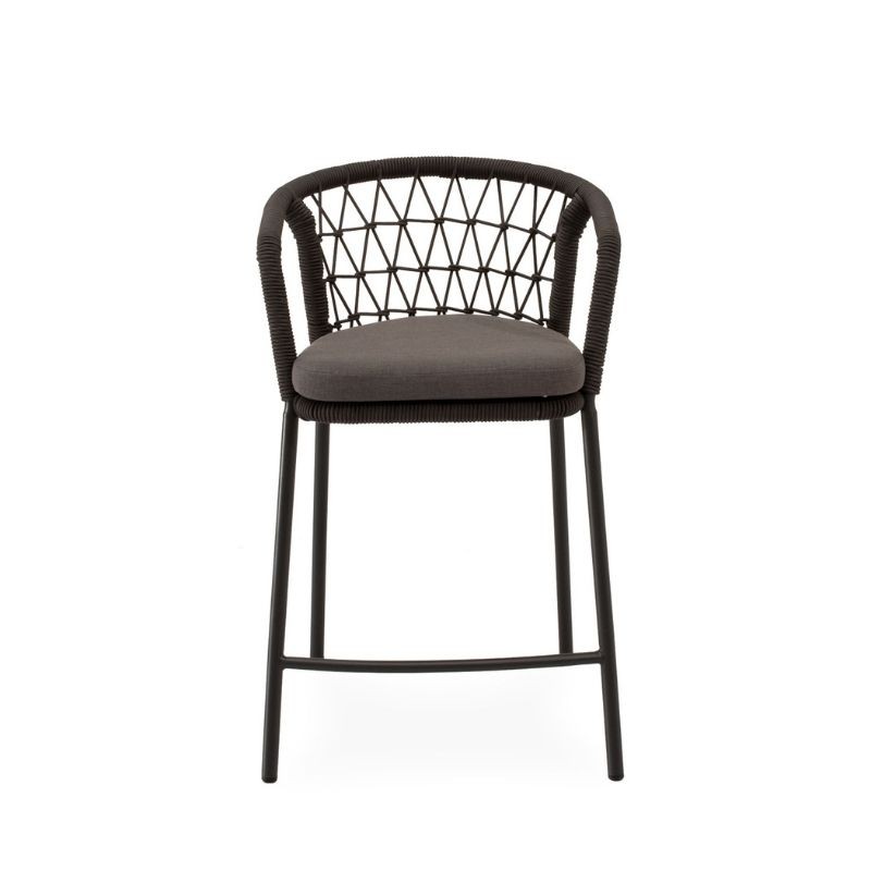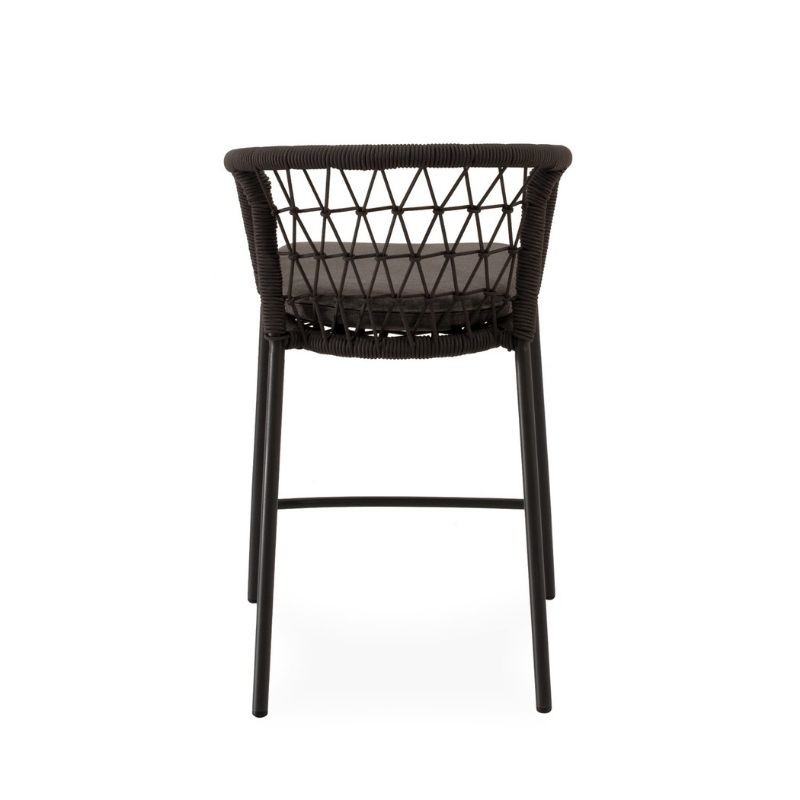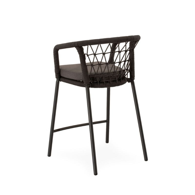 O banco de exterior EDWIN cinza tem encosto curvo, envolto em corda entrelaçada, e pernas de aço robustas e ligeiramente inclinadas.