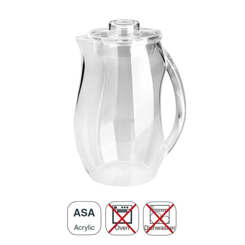 Jarro de 2,8 litros, com tampa fabricado em plástico acrílico transparente apto para alimentação livre de odores e sabores.