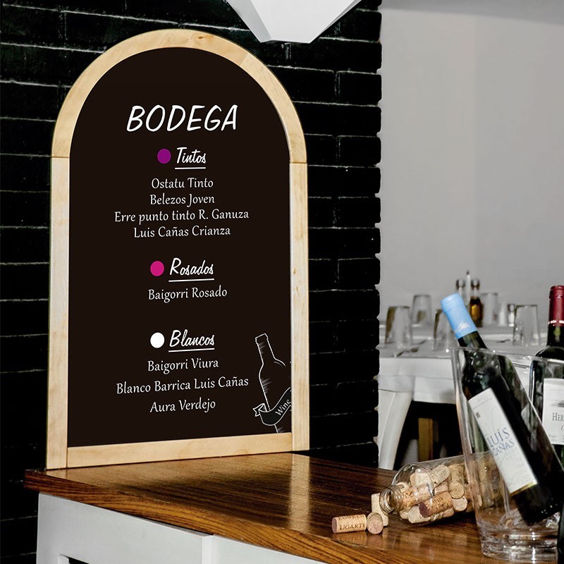 Quadro semi-círculo de 50x80 cm projetada para ser colocada na parede e escrever sobre ela com giz ou caneta Lacor. Ideal para personalizar menus em hotelaria e restauração.