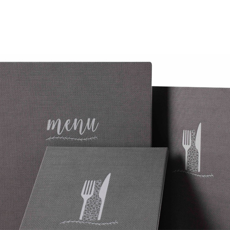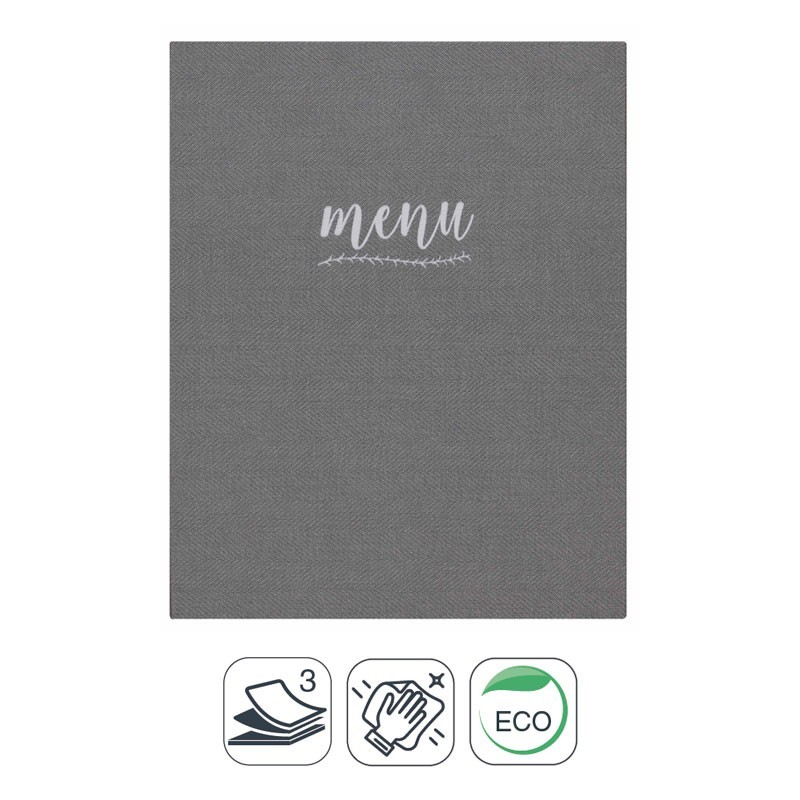 Portamenús coleção Francis é fabricado em imitação de pele com termosellado na cor branca e luvas de PVC com rosca interior. Ideal para hotelaria e restauração. Tamanho a escolher.