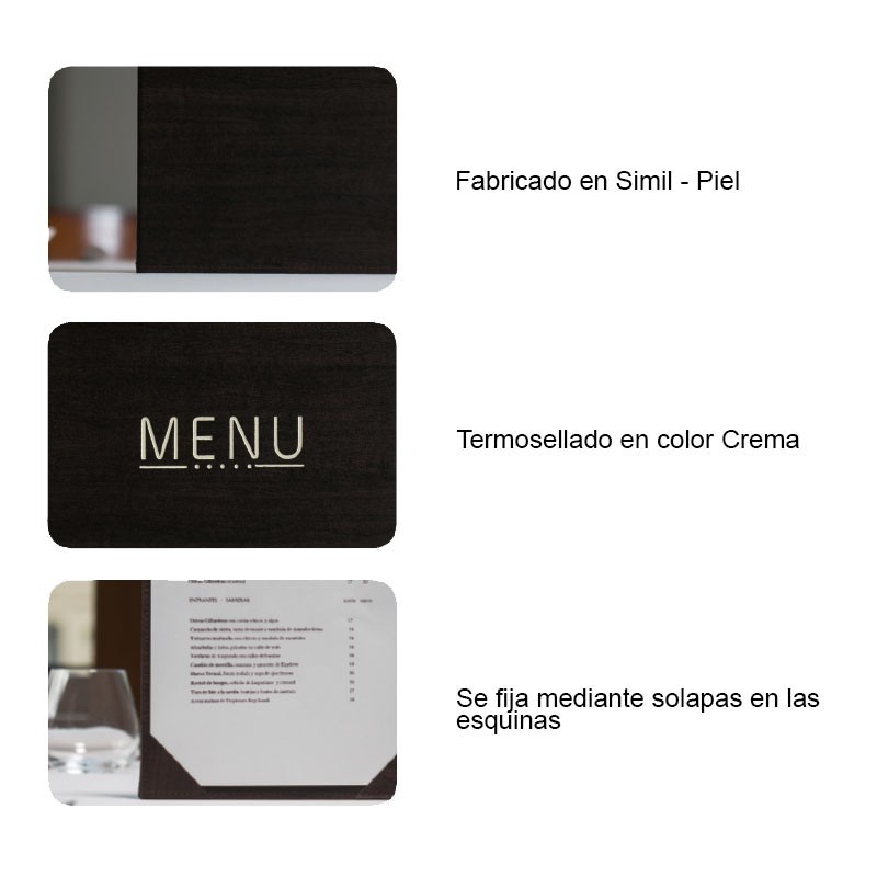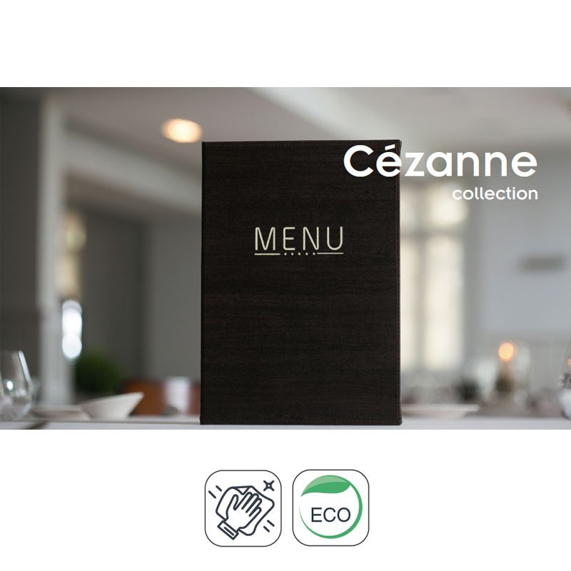 Portamenús coleção Cézane é fabricado em imitação de pele flexível com termosellado em cor creme e abas fixas para a tampa. Ideal para hotelaria e restauração. Tamanho A4: 23x32 cm