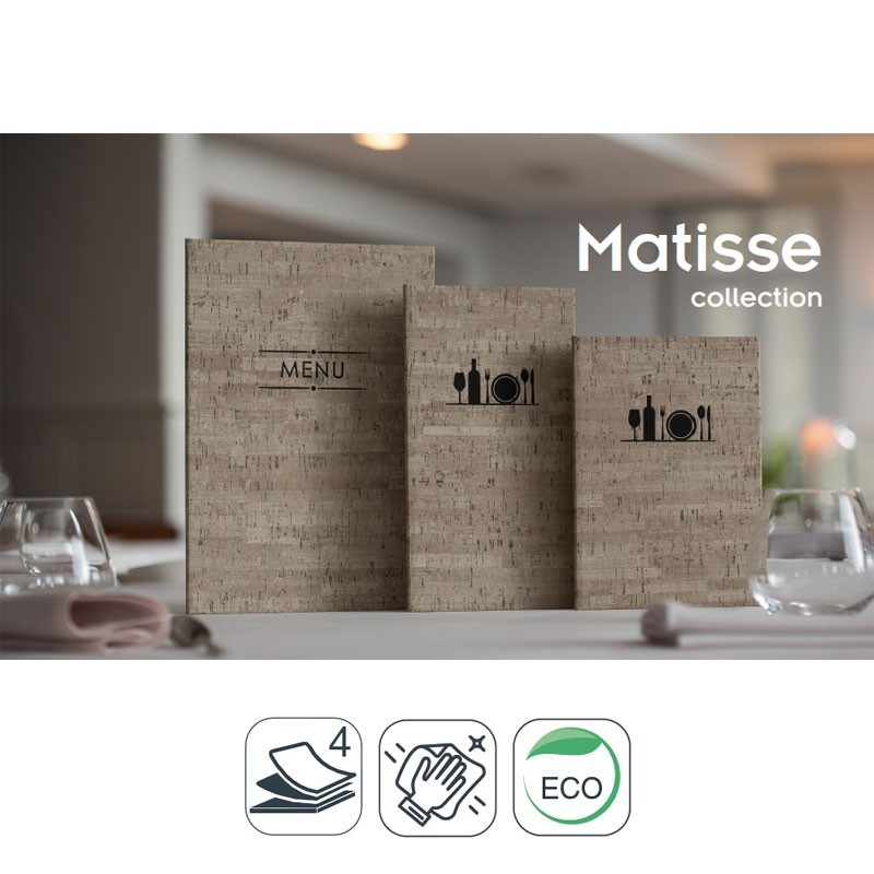 Portamenús coleção Matisse é fabricado em imitação de pele com termosellado na cor preta e luvas fixas de PVC. Ideal para hotelaria e restauração. Tamanho a escolher.