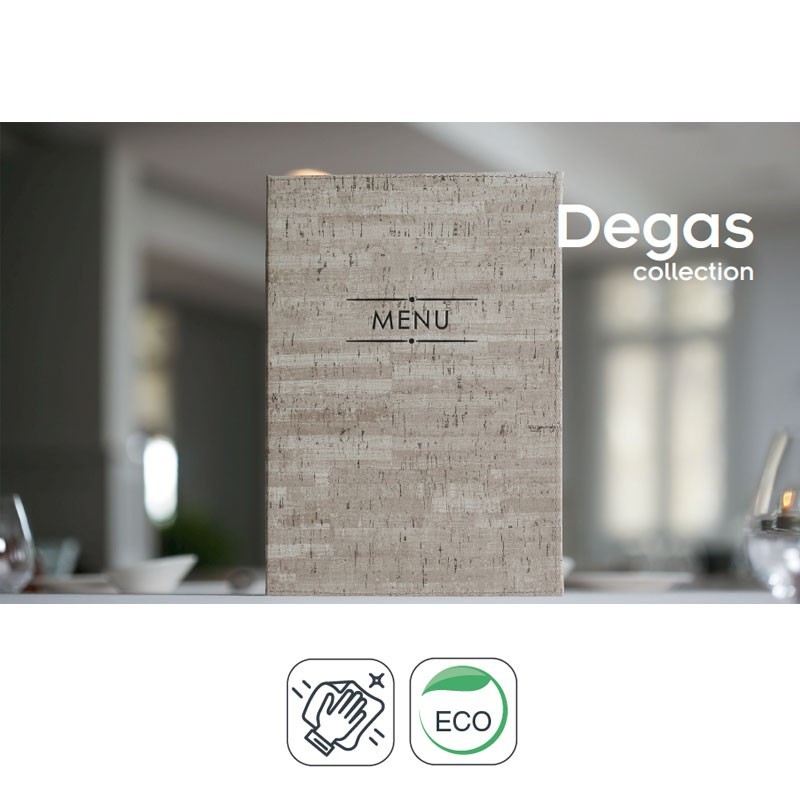 Portamenús coleção Degas é fabricado em imitação de pele flexível com termosellado em cor creme e abas fixas para a tampa. Ideal para hotelaria e restauração. Tamanho A4: 23x32 cm