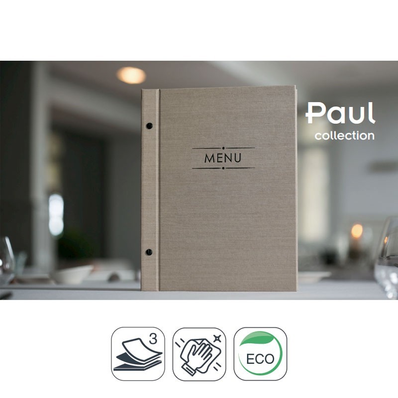Portamenús coleção Paul fabricados em Telflex com termosellado na cor preta e luvas de PVC com rosca externa. Ideal para hotelaria e restauração. Tamanho A4: 25,5x32 cm