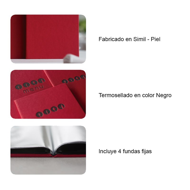 Portamenús coleção Millet é fabricado em imitação de pele com termosellado na cor preta e luvas fixas de PVC. Ideal para hotelaria e restauração. Tamanho a escolher.