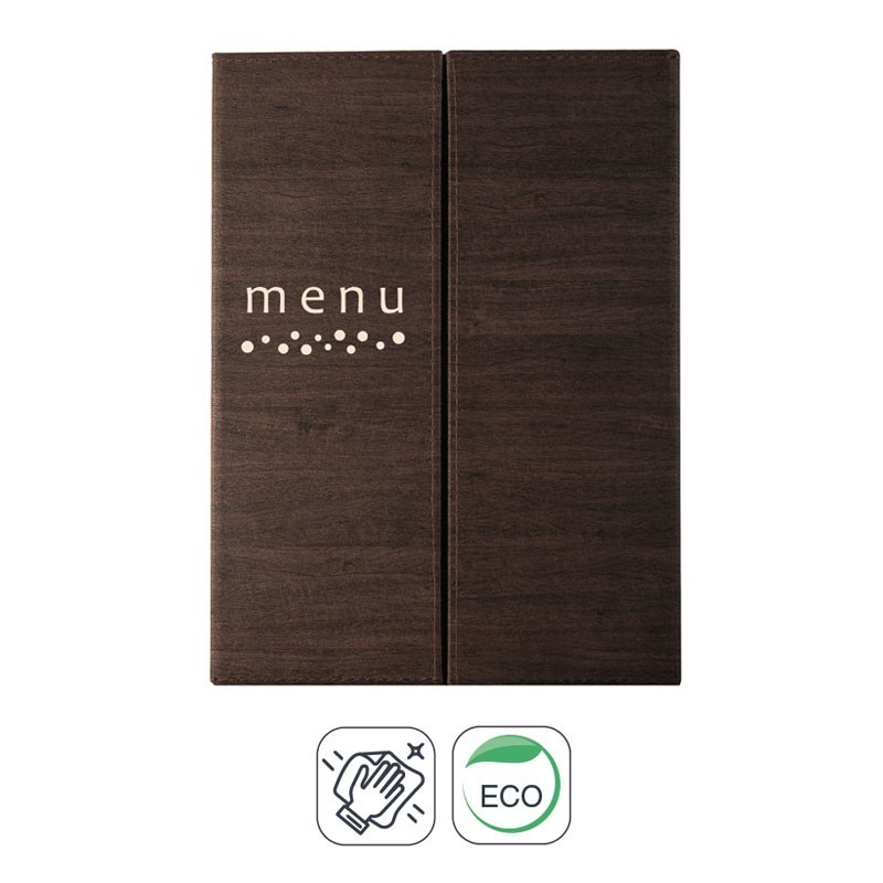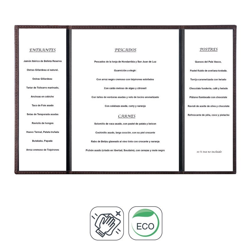 Portamenús coleção Leo é fabricado em imitação de pele com termosellado em cor creme e 3 abas transparentes. Ideal para hotelaria e restauração. Tamanho A4: 23x32 cm