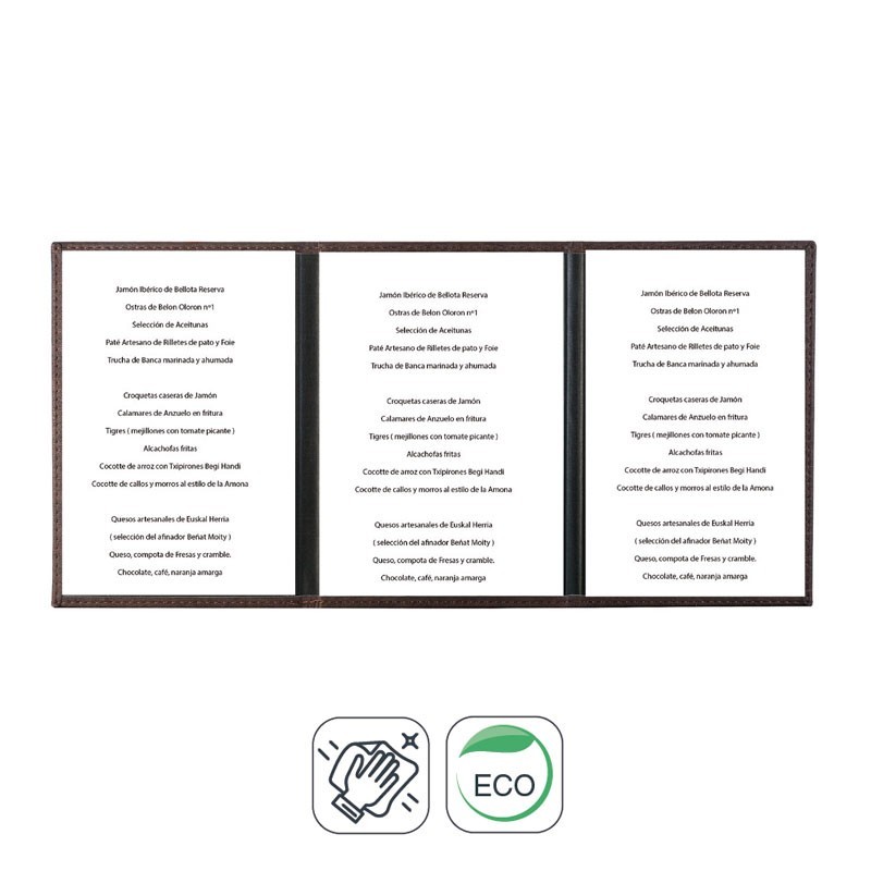 Portamenús coleção Tiziano é fabricado em imitação de pele com termosellado em cor creme e 3 abas transparentes. Ideal para hotelaria e restauração. Tamanho A5: 17x24 cm
