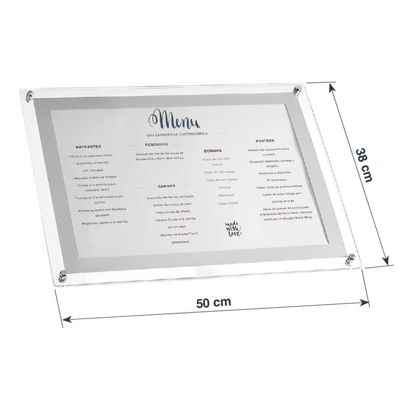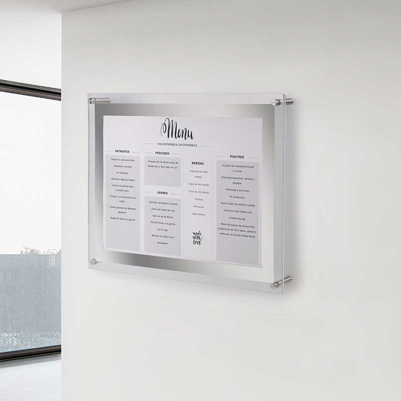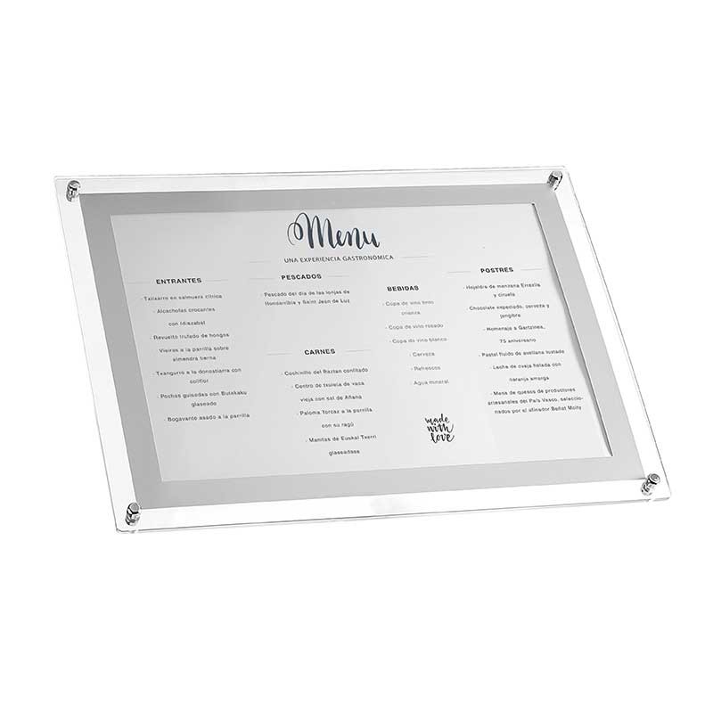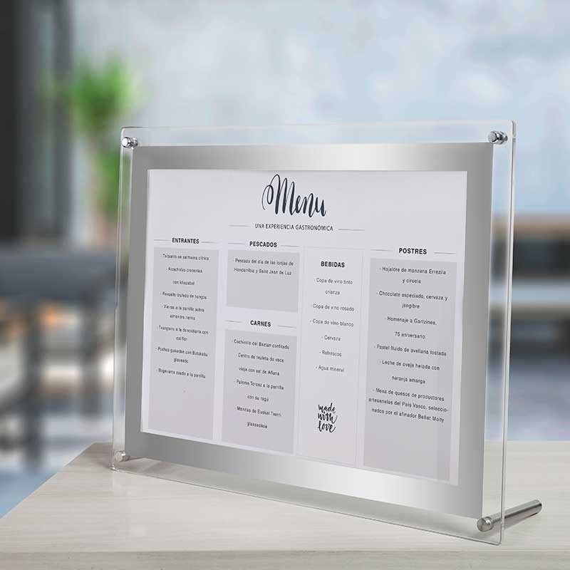 Porta-menus tamanho A3 com painel acrílico. 3 possibilidades de montagem: de pé, de parede e em cima de uma mesa.
