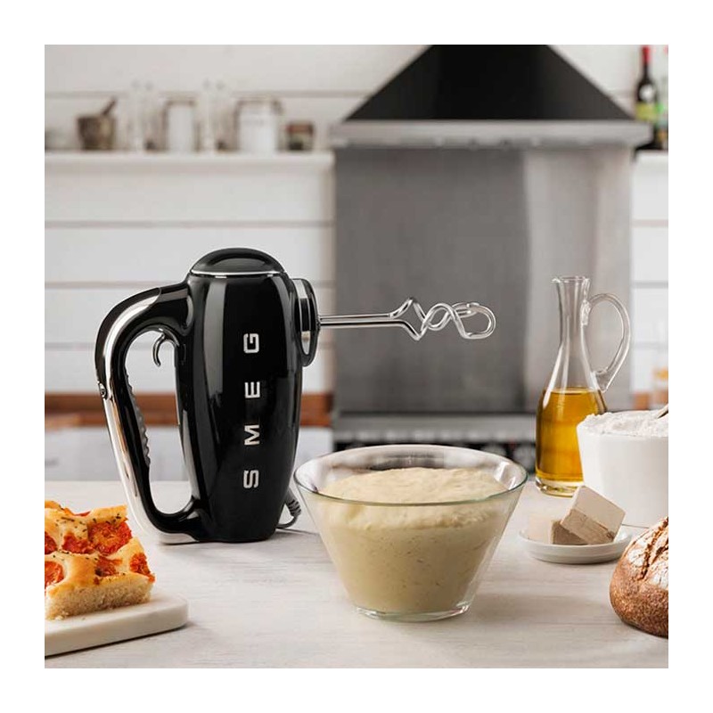 Smeg 50's estilo Batedeira Elétrica Acabamento preto brilho com 250 W de potência, 9 níveis de velocidade e função turbo.